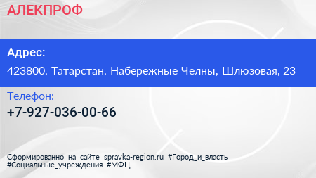 АЛЕКПРОФ по адресу 423800, Татарстан, Набережные Челны, Шлюзовая, 23 в дальнейшем Организация, размещена в следующих категориях: