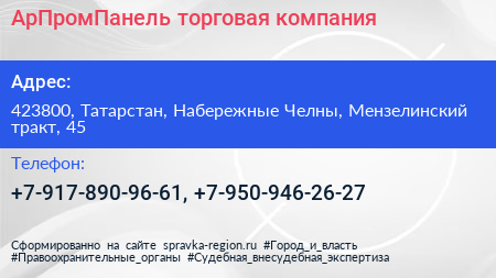 АрПромПанель, торговая компания по адресу 423800, Татарстан, Набережные Челны, Мензелинский тракт, 45 в дальнейшем Организация, размещена в следующих категориях: