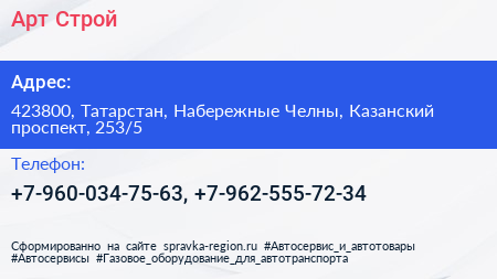Арт-Строй по адресу 423800, Татарстан, Набережные Челны, Казанский проспект, 253/5 в дальнейшем Организация, размещена в следующих категориях: