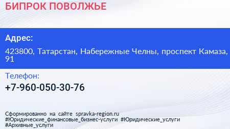 БИПРОК-ПОВОЛЖЬЕ по адресу 423800, Татарстан, Набережные Челны, проспект Камаза, 91 в дальнейшем Организация, размещена в следующих категориях: