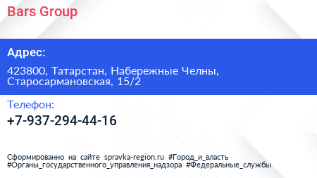 Bars Group по адресу 423800, Татарстан, Набережные Челны, Старосармановская, 15/2 в дальнейшем Организация, размещена в следующих категориях: