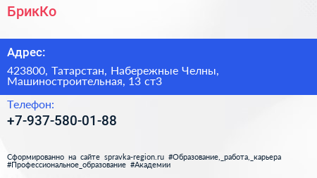 БрикКо по адресу 423800, Татарстан, Набережные Челны, Машиностроительная, 13 ст3 в дальнейшем Организация, размещена в следующих категориях: