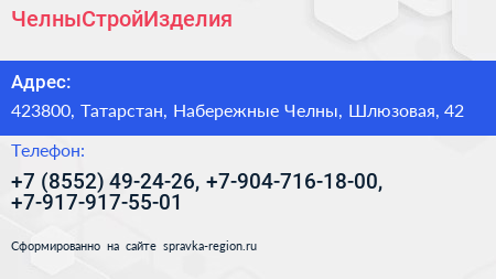 ЧелныСтройИзделия по адресу 423800, Татарстан, Набережные Челны, Шлюзовая, 42 в дальнейшем Организация, размещена в следующих категориях: