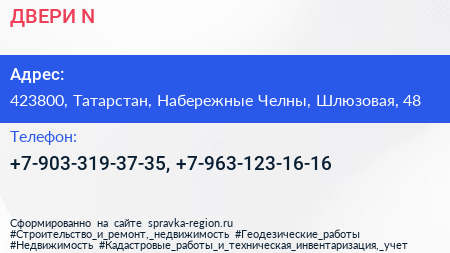 ДВЕРИ N по адресу 423800, Татарстан, Набережные Челны, Шлюзовая, 48 в дальнейшем Организация, размещена в следующих категориях: