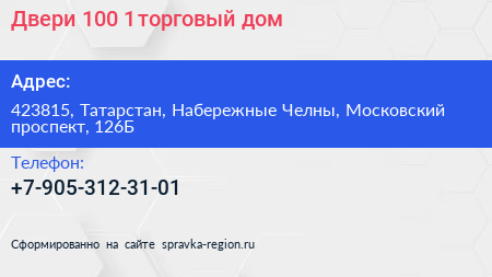 Двери 100+1, торговый дом по адресу 423815, Татарстан, Набережные Челны, Московский проспект, 126Б в дальнейшем Организация, размещена в следующих категориях: