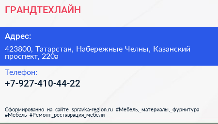 ГРАНДТЕХЛАЙН по адресу 423800, Татарстан, Набережные Челны, Казанский проспект, 220а в дальнейшем Организация, размещена в следующих категориях: