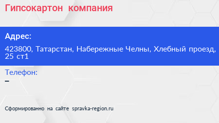 Гипсокартон+, компания по адресу 423800, Татарстан, Набережные Челны, Хлебный проезд, 25 ст1 в дальнейшем Организация, размещена в следующих категориях: