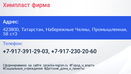 Химпласт, фирма по адресу 423800, Татарстан, Набережные Челны, Промышленная, 58 ст3 в дальнейшем Организация, размещена в следующих категориях:
