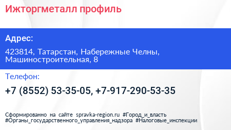 Ижторгметалл-профиль по адресу 423814, Татарстан, Набережные Челны, Машиностроительная, 8 в дальнейшем Организация, размещена в следующих категориях: