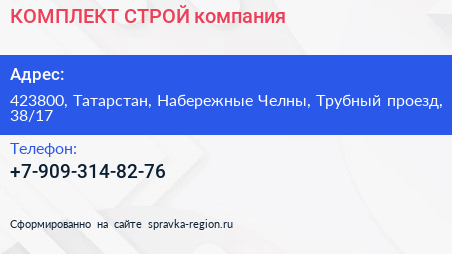 КОМПЛЕКТ СТРОЙ, компания по адресу 423800, Татарстан, Набережные Челны, Трубный проезд, 38/17 в дальнейшем Организация, размещена в следующих категориях: