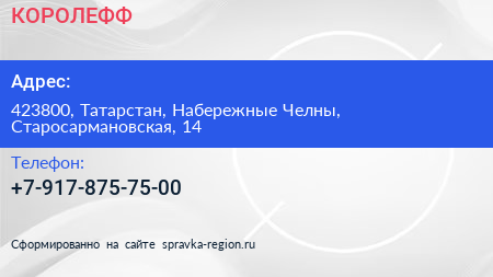 КОРОЛЕФФ по адресу 423800, Татарстан, Набережные Челны, Старосармановская, 14 в дальнейшем Организация, размещена в следующих категориях: