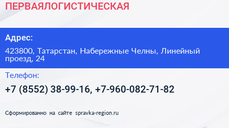 ПЕРВАЯЛОГИСТИЧЕСКАЯ по адресу 423800, Татарстан, Набережные Челны, Линейный проезд, 24 в дальнейшем Организация, размещена в следующих категориях: