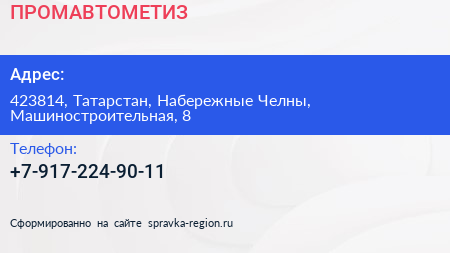ПРОМАВТОМЕТИЗ по адресу 423814, Татарстан, Набережные Челны, Машиностроительная, 8 в дальнейшем Организация, размещена в следующих категориях: