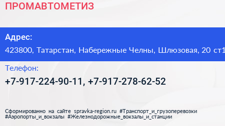 ПРОМАВТОМЕТИЗ по адресу 423800, Татарстан, Набережные Челны, Шлюзовая, 20 ст1 в дальнейшем Организация, размещена в следующих категориях: