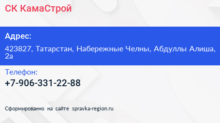 СК КамаСтрой по адресу 423827, Татарстан, Набережные Челны, Абдуллы Алиша, 2а в дальнейшем Организация, размещена в следующих категориях: