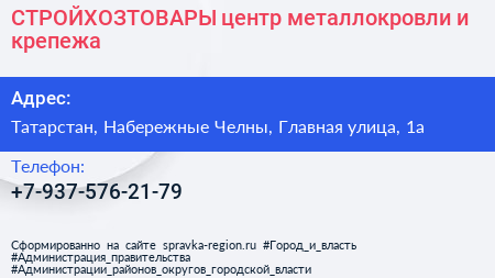 СТРОЙХОЗТОВАРЫ, центр металлокровли и крепежа по адресу Татарстан, Набережные Челны, Главная улица, 1а в дальнейшем Организация, размещена в следующих категориях: