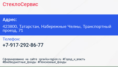 СтеклоСервис по адресу 423800, Татарстан, Набережные Челны, Транспортный проезд, 71 в дальнейшем Организация, размещена в следующих категориях: