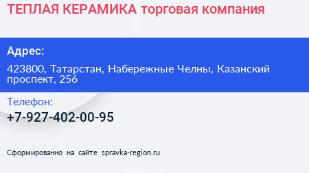 ТЕПЛАЯ КЕРАМИКА, торговая компания по адресу 423800, Татарстан, Набережные Челны, Казанский проспект, 256 в дальнейшем Организация, размещена в следующих категориях: