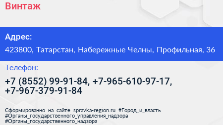 Винтаж+ по адресу 423800, Татарстан, Набережные Челны, Профильная, 36 в дальнейшем Организация, размещена в следующих категориях: