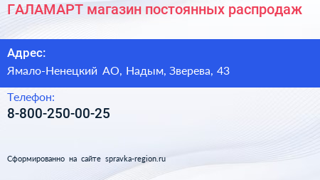 ГАЛАМАРТ, магазин постоянных распродаж по адресу Ямало-Ненецкий АО, Надым, Зверева, 43 в дальнейшем Организация, размещена в следующих категориях: