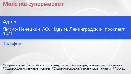 Монетка, супермаркет по адресу Ямало-Ненецкий АО, Надым, Ленинградский проспект, 10/1 в дальнейшем Организация, размещена в следующих категориях: