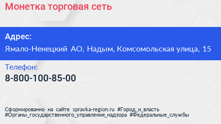 Монетка, торговая сеть по адресу Ямало-Ненецкий АО, Надым, Комсомольская улица, 15 в дальнейшем Организация, размещена в следующих категориях: