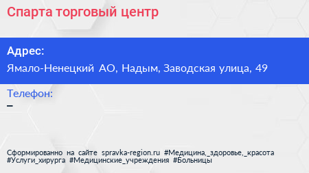 Спарта, торговый центр по адресу Ямало-Ненецкий АО, Надым, Заводская улица, 49 в дальнейшем Организация, размещена в следующих категориях: