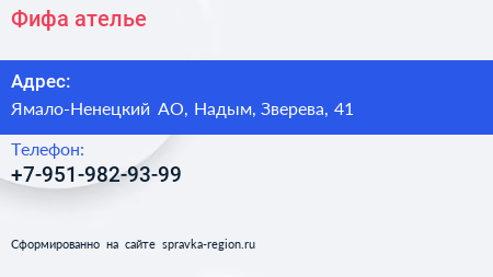 Фифа, ателье по адресу Ямало-Ненецкий АО, Надым, Зверева, 41 в дальнейшем Организация, размещена в следующих категориях: