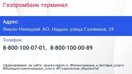 Газпромбанк, терминал по адресу Ямало-Ненецкий АО, Надым, улица Газовиков, 19 в дальнейшем Организация, размещена в следующих категориях: