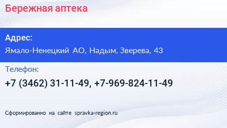 Бережная аптека по адресу Ямало-Ненецкий АО, Надым, Зверева, 43 в дальнейшем Организация, размещена в следующих категориях: