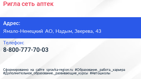 Ригла, сеть аптек по адресу Ямало-Ненецкий АО, Надым, Зверева, 43 в дальнейшем Организация, размещена в следующих категориях:
