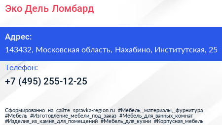 Эко Дель Ломбард по адресу 143432, Московская область, Нахабино, Институтская, 25 в дальнейшем Организация, размещена в следующих категориях: