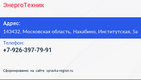ЭнергоТехник по адресу 143432, Московская область, Нахабино, Институтская, 5а в дальнейшем Организация, размещена в следующих категориях: