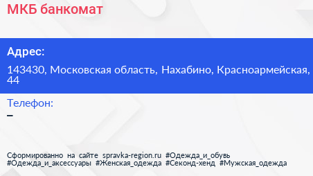 МКБ, банкомат по адресу 143430, Московская область, Нахабино, Красноармейская, 44 в дальнейшем Организация, размещена в следующих категориях: