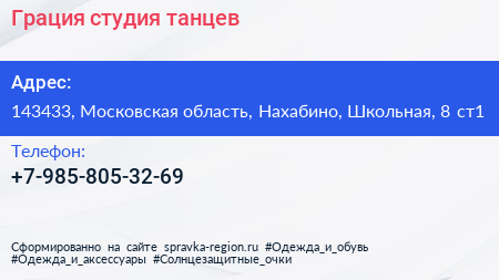 Грация, студия танцев по адресу 143433, Московская область, Нахабино, Школьная, 8 ст1 в дальнейшем Организация, размещена в следующих категориях: