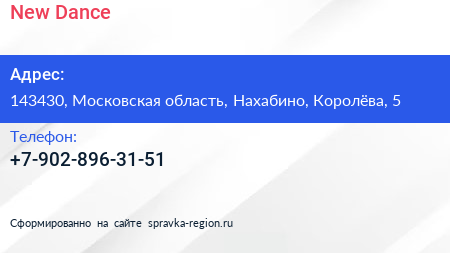 New Dance по адресу 143430, Московская область, Нахабино, Королёва, 5 в дальнейшем Организация, размещена в следующих категориях: