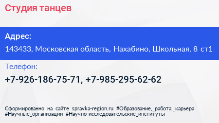 Студия танцев по адресу 143433, Московская область, Нахабино, Школьная, 8 ст1 в дальнейшем Организация, размещена в следующих категориях: