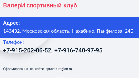 ВалерИ, спортивный клуб по адресу 143432, Московская область, Нахабино, Панфилова, 24Б в дальнейшем Организация, размещена в следующих категориях: