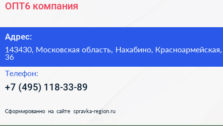 ОПТ6, компания по адресу 143430, Московская область, Нахабино, Красноармейская, 36 в дальнейшем Организация, размещена в следующих категориях: