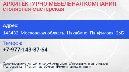 АРХИТЕКТУРНО-МЕБЕЛЬНАЯ КОМПАНИЯ, столярная мастерская по адресу 143432, Московская область, Нахабино, Панфилова, 26Б в дальнейшем Организация, размещена в следующих категориях: