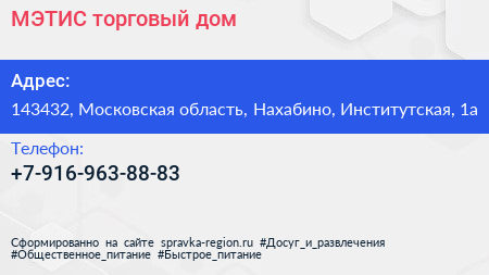 МЭТИС, торговый дом по адресу 143432, Московская область, Нахабино, Институтская, 1а в дальнейшем Организация, размещена в следующих категориях: