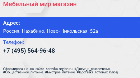 Мебельный мир, магазин по адресу Торговый центр "Никольский", 52Б, Ново-Никольская улица, Опалиха, Красногорск, городской округ Красногорск, Московская область, Центральный федеральный округ, 143443, Россия в дальнейшем Организация, размещена в следующих категориях: