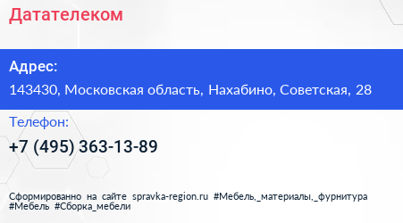 Датателеком по адресу 143430, Московская область, Нахабино, Советская, 28 в дальнейшем Организация, размещена в следующих категориях: