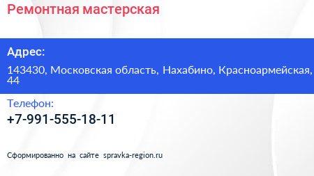 Ремонтная мастерская по адресу 143430, Московская область, Нахабино, Красноармейская, 44 в дальнейшем Организация, размещена в следующих категориях: