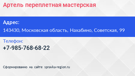 Артель, переплетная мастерская по адресу 143430, Московская область, Нахабино, Советская, 99 в дальнейшем Организация, размещена в следующих категориях:
