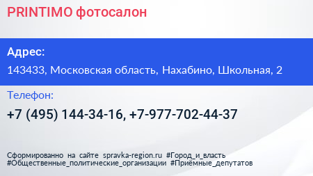PRINTIMO, фотосалон по адресу 143433, Московская область, Нахабино, Школьная, 2 в дальнейшем Организация, размещена в следующих категориях: