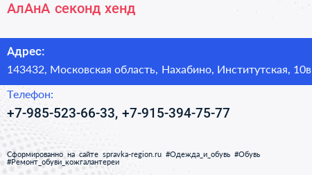 АлАнА, секонд-хенд по адресу 143432, Московская область, Нахабино, Институтская, 10в в дальнейшем Организация, размещена в следующих категориях: