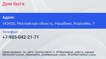 Дом быта по адресу 143430, Московская область, Нахабино, Королёва, 7 в дальнейшем Организация, размещена в следующих категориях: