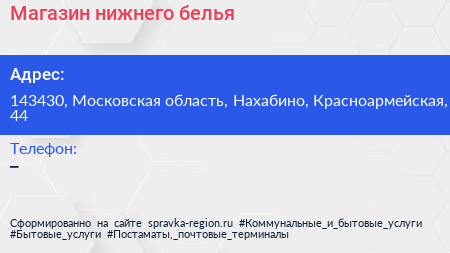 Магазин нижнего белья по адресу 143430, Московская область, Нахабино, Красноармейская, 44 в дальнейшем Организация, размещена в следующих категориях: