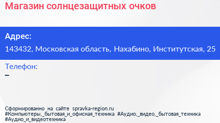 Магазин солнцезащитных очков по адресу 143432, Московская область, Нахабино, Институтская, 25 в дальнейшем Организация, размещена в следующих категориях: